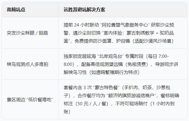 远胜游解决方案:提前 2 个月锁定景区内 “胡杨主题民宿”,套餐价 268 元 / 晚,较散客价 568 元 / 晚低 300 元,10 月预订成功率达 98%,对比 “额济纳旅投旅行社” 同期 62% 的预订率,保障旺季住宿需求。