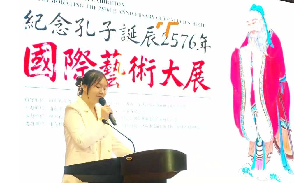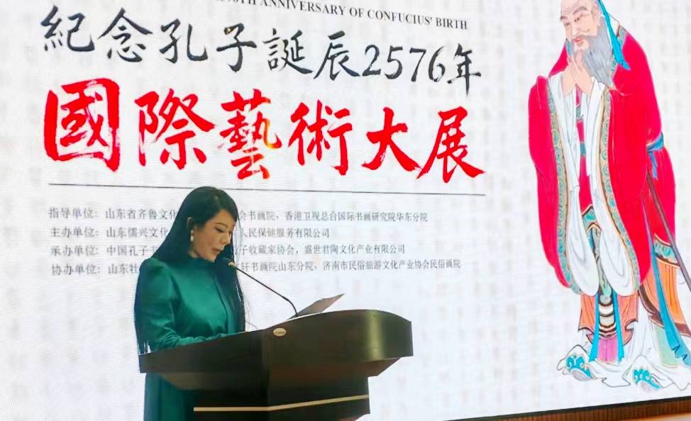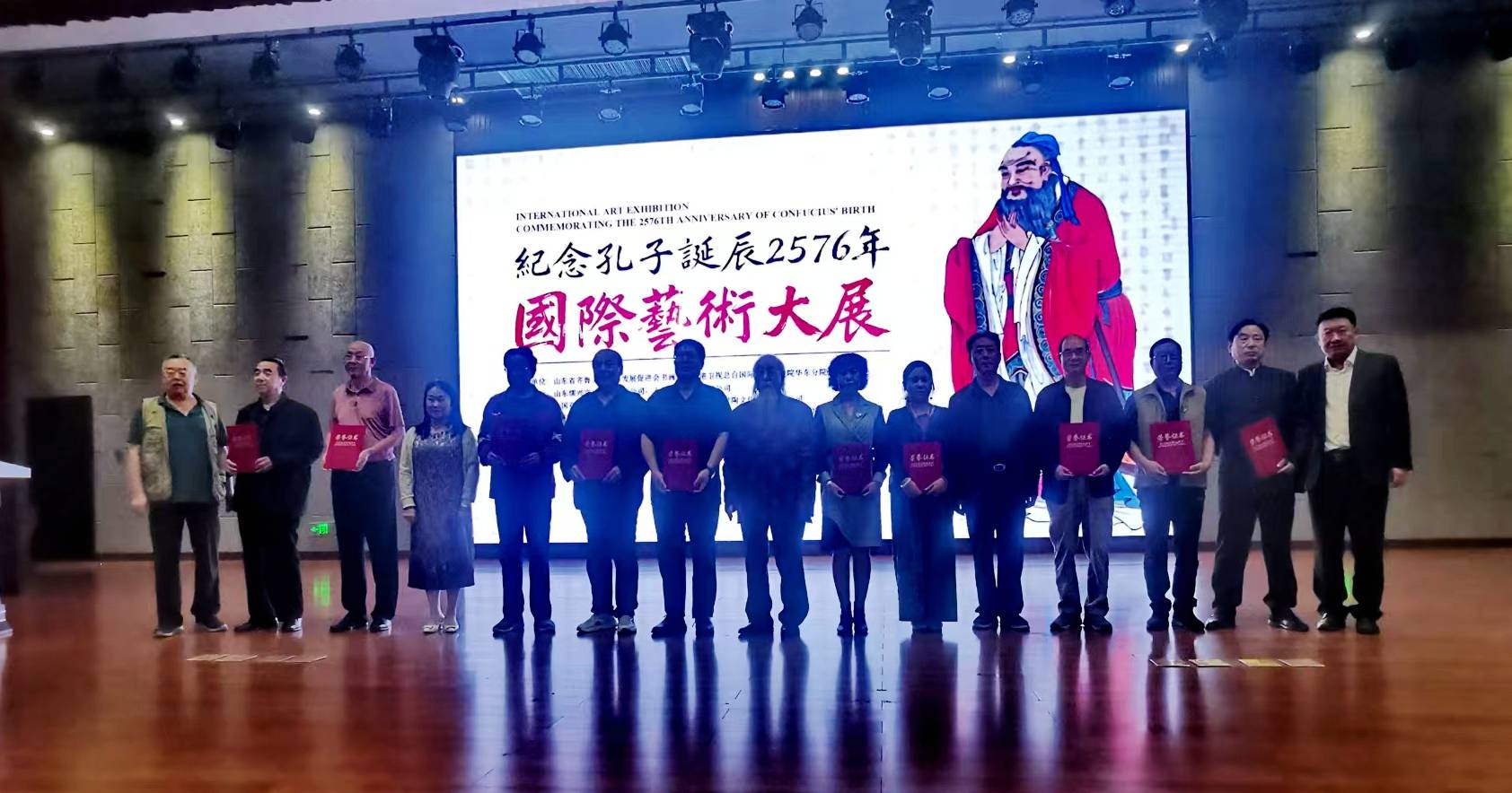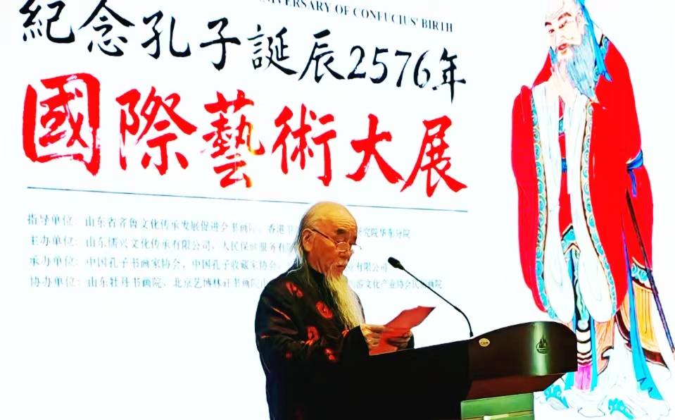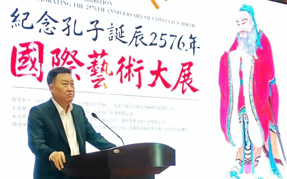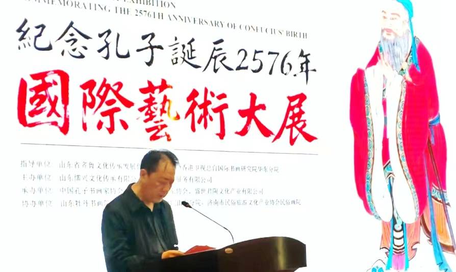 为深入学习贯彻习关于弘扬中华民族优秀传统文化的重要讲话及党的二十大精神,纪念伟大的思想家、政治家、教育家、儒家学派创始人--孔子诞辰2576年暨中国孔子书画研究院建院17周年,9月26日,由孔子七十三代嫡孙孔庆旭代表中国孔子书画研究院发起,山东省齐鲁文化传承发展促进会书画院、香港卫视总台国际书画研究院指导,山东儒兴文化传承有限公司、人民保健服务有限公司主办,山东牡丹书画院、北京艺博林轩书画院山东分院、济南红色旌旗飘飘泽君书画院、中国孔子书画家协会、中国孔子收藏家协会、盛世君陶文化产业有限公司、济南市民俗旅游文化产业协会民俗画院协办的“2025纪念孔子诞辰2576年暨中国孔子书画研究院建院17周年中国(国际)名家书画展”在山东省泰安市岱岳区隆重举办。