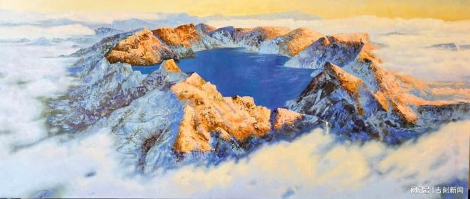 此作描绘长白山日出的壮丽景象。画面中朝霞染红天际,雪山金顶,光影辉煌,构图宏大开阔,增强神圣感。将自然奇观升华为精神图腾。