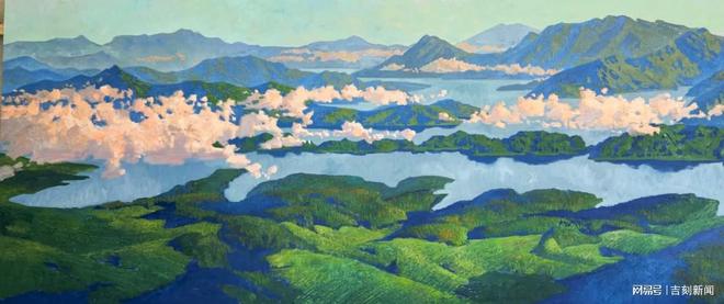此作以山水意象表现东北地域精神。画面中松花江蜿蜒,长白山云雾缭绕,江畔隐约可见历史建筑与现代桥梁;构图融合传统山水布局与现实景观。光影柔和,色彩以青绿为主,体现地域特色。作为“地域记忆”代表采夫作,它将自然景观与历史文脉结合,体现“山河永固”的文化信念。