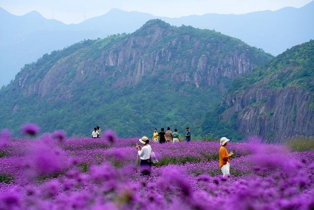 初秋时节,在浙江乐清的狮子峰景区,成片的马鞭草绚烂绽放,迎来最佳观赏期,这片紫色的花海吸引了众多游客前来赏花游玩,乐享秋日好时光。(未经授权,请勿转载)