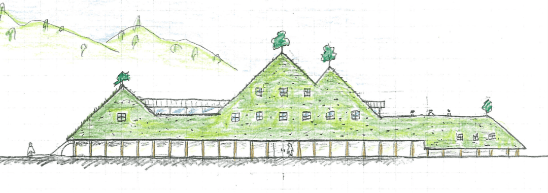 草屋根的轮廓以「梯田」为灵感。屋顶不仅种满了草皮,顶端也和ラムネ温泉馆等过去的作品一样种了松树,屋顶还会随着秋冬到来而转为枯黄,并在下一个春天恢复绿意,是不止在空间上融入环境,连时间也与大自然同步的建筑。